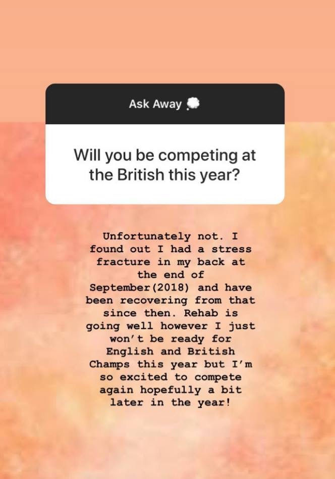 Lucy Stanhope, who competed for the silver-winning English team at the 2018 Commonwealth Games and the British team at the 2018 European Championships, will miss the upcoming English and British Championships. She said in an Instagram story that she is recovering from a stress fracture in her back that was diagnosed last September. She did not specify the timeline for her competition comeback and whether she will be ready in time for the European championships.