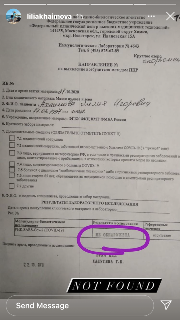Then Lilia Akhaimova posted the result of her COVID-19 test on Instagram. The document is issued on 22nd of October and states that test was negative. Akhaimova has not offered any comments, so it is not clear what happened and what prompted Rodionenko to claim Akhaimova was infected.
