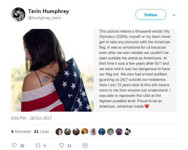 Humphrey received backlash in October of 2017 for posting a tone-deaf tweet about her Olympic experience on the same day as Mckayla Maroney came forward as a sexual abuse survivor. Humphrey complained about not being able to walk around Athens wrapped around in the American flag.