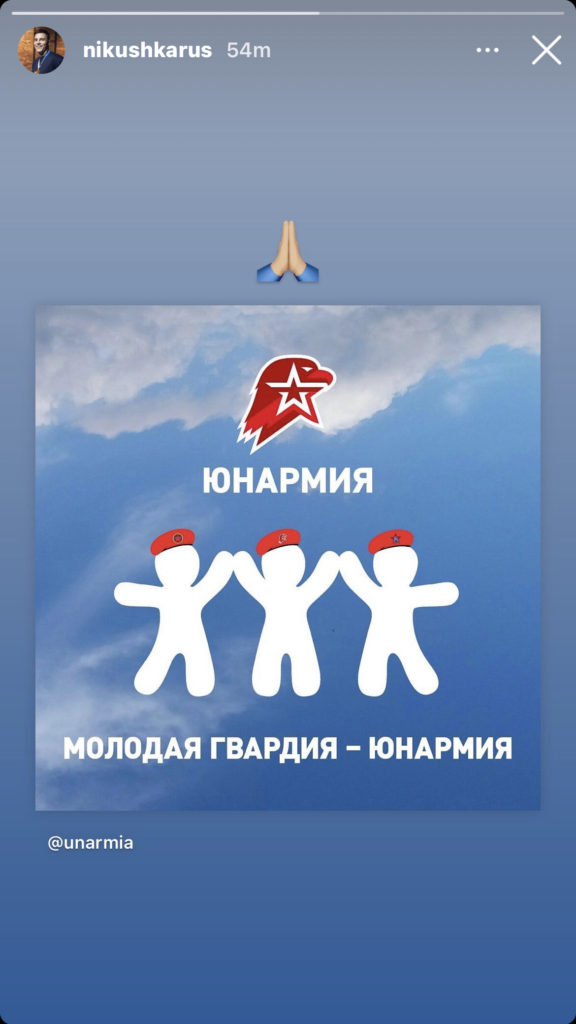 Nikita Nagorny, while staying silent on the matter, shared a post from the Young Army organization in his Instagram story. The post announced the collaboration between the Young Army movement of Donetsk and Luhanks regions and the Russian organization. The Young Army Cades National Movement is a militarized patriotic youth organization that aims to raise a generation loyal to Putin’s regime. The organization, among other things, works on spreading propaganda in the Ukrainian territories occupied by Russia. It is financed by the Russian Ministry of Defence. Nagorny became the head of the General Staff of the organization in 2020 and it is not a simply nominal position – he has been actively involved in the organization, especially after the Tokyo Olympics when he had a bit of a break from training and competing.